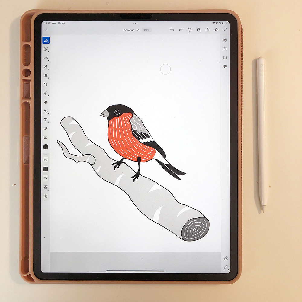 Håndtegnet dompap på gren av Katrine Kalleklev/Bokhjelpen